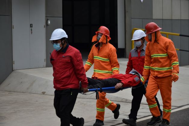 消防演練正式開(kāi)始,李總宣布啟動(dòng)“環(huán)保消防應(yīng)急預(yù)案演習(xí)”,接到2#倉(cāng)庫(kù)火情報(bào)警信息后,立即啟動(dòng)應(yīng)急預(yù)案,各小組按應(yīng)急預(yù)案快速投入滅火、救治等工作中。通訊與警戒組現(xiàn)場(chǎng)進(jìn)行調(diào)度、警戒,并對(duì)火災(zāi)現(xiàn)場(chǎng)進(jìn)行封鎖。醫(yī)療救護(hù)組對(duì)傷員進(jìn)行轉(zhuǎn)移、臨時(shí)急救。搶險(xiǎn)搶修組身著滅火服對(duì)著火點(diǎn)實(shí)施滅火。